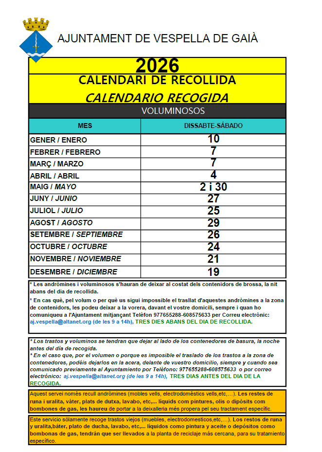És molt important que la comunicació a l'Ajuntament la realitzeu 3 DIES ABANS del dia a la recollida i SEMPRE EN HORARI D'ATENCIÓ AL PÚBLIC DE 9 A 14H.