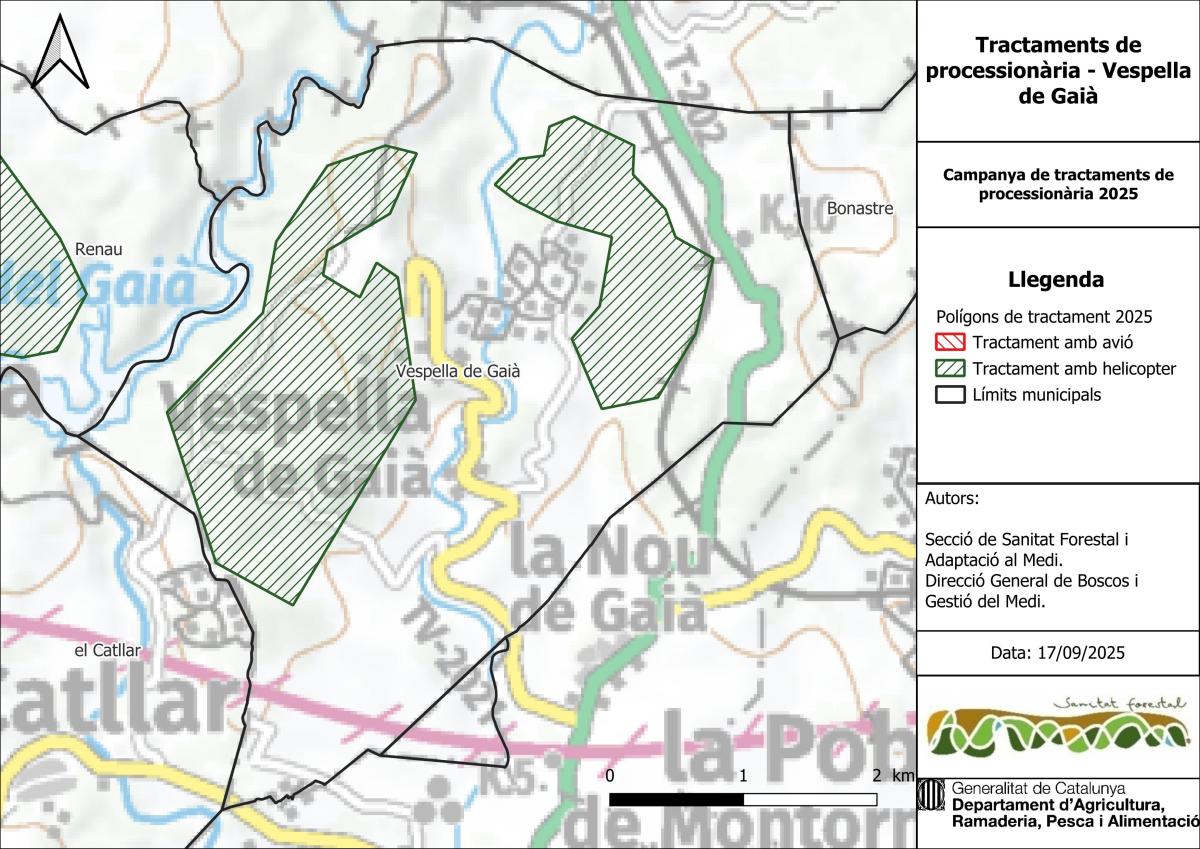 Aquesta setmana el Departament de Medi Ambient de la Generalitat de Catalunya ha realitzat un tractament aeri amb helicòpter mitjançant l’aplicació d’un producte biològic (Bacillus thuringiensis) per combatre la processionària del pi a les zones indicades en aquest plànol: